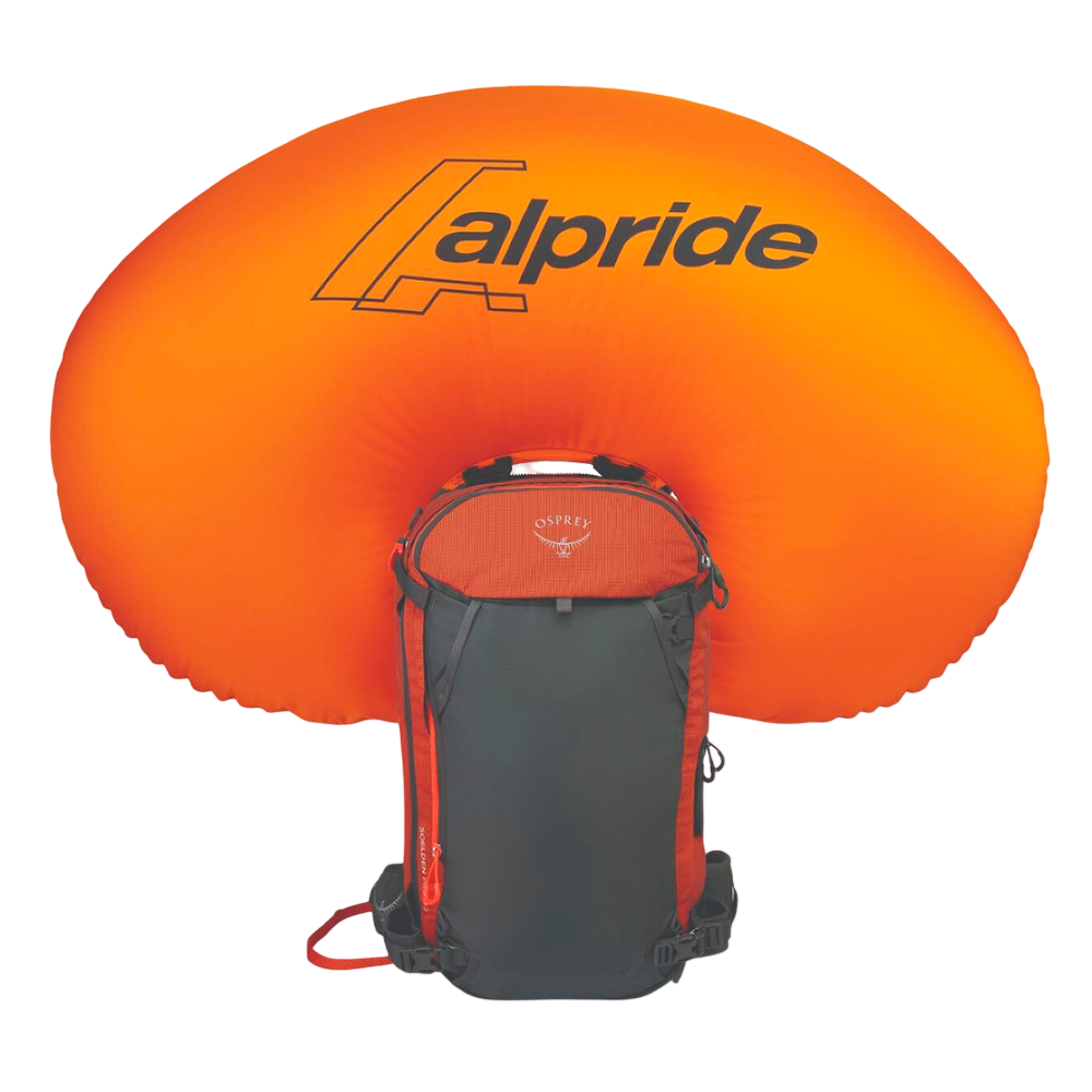 Система Alpride E2 работает на базе суперконденсаторов, что делает её надёжной при низких температурах и удобной в эксплуатации — без необходимости замены газовых баллонов. Рюкзак сочетает лавинную защиту и комфортную посадку, характерную для горной серии Osprey.