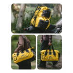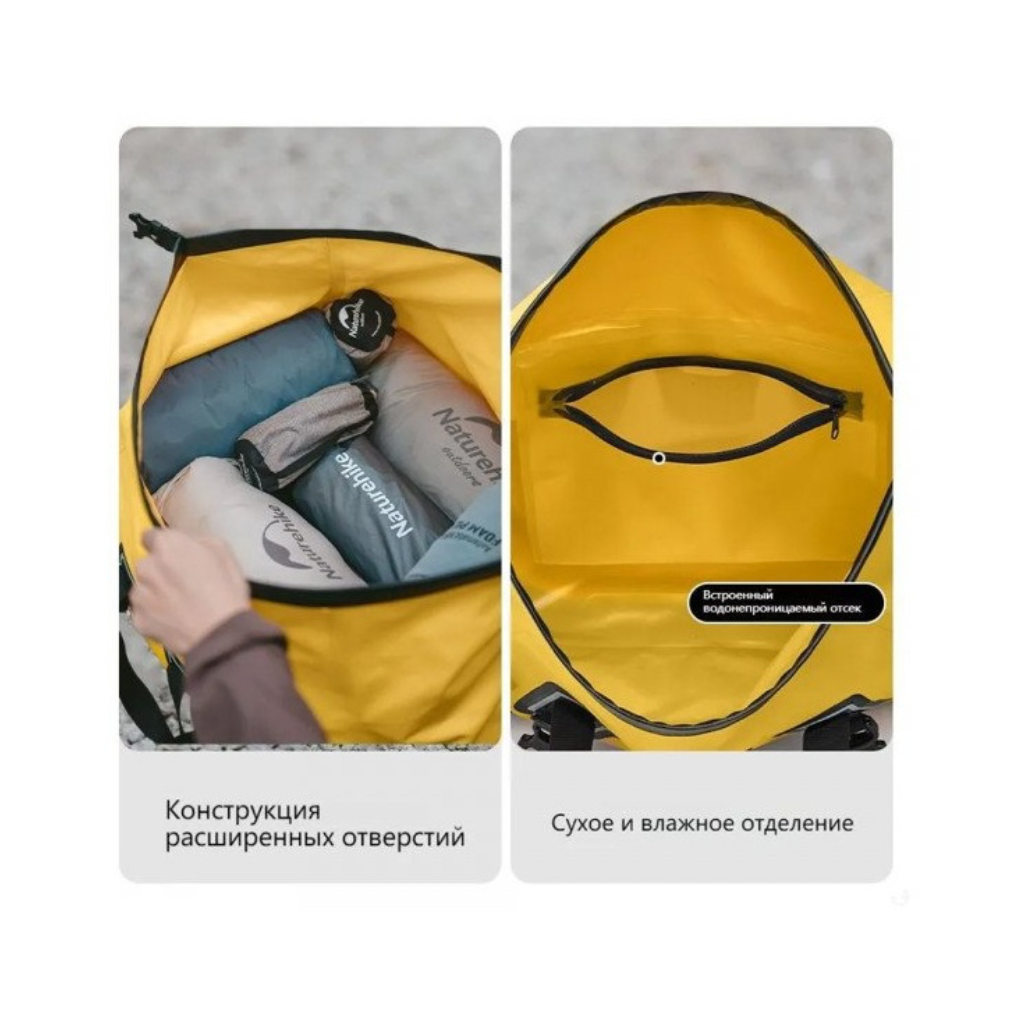 Сумка выполнена из прочного материала с водонепроницаемым покрытием и герметичной системой закрытия (roll-top), что обеспечивает надёжную защиту содержимого от воды, грязи и пыли. Яркий жёлтый цвет повышает видимость и удобство использования на природе.